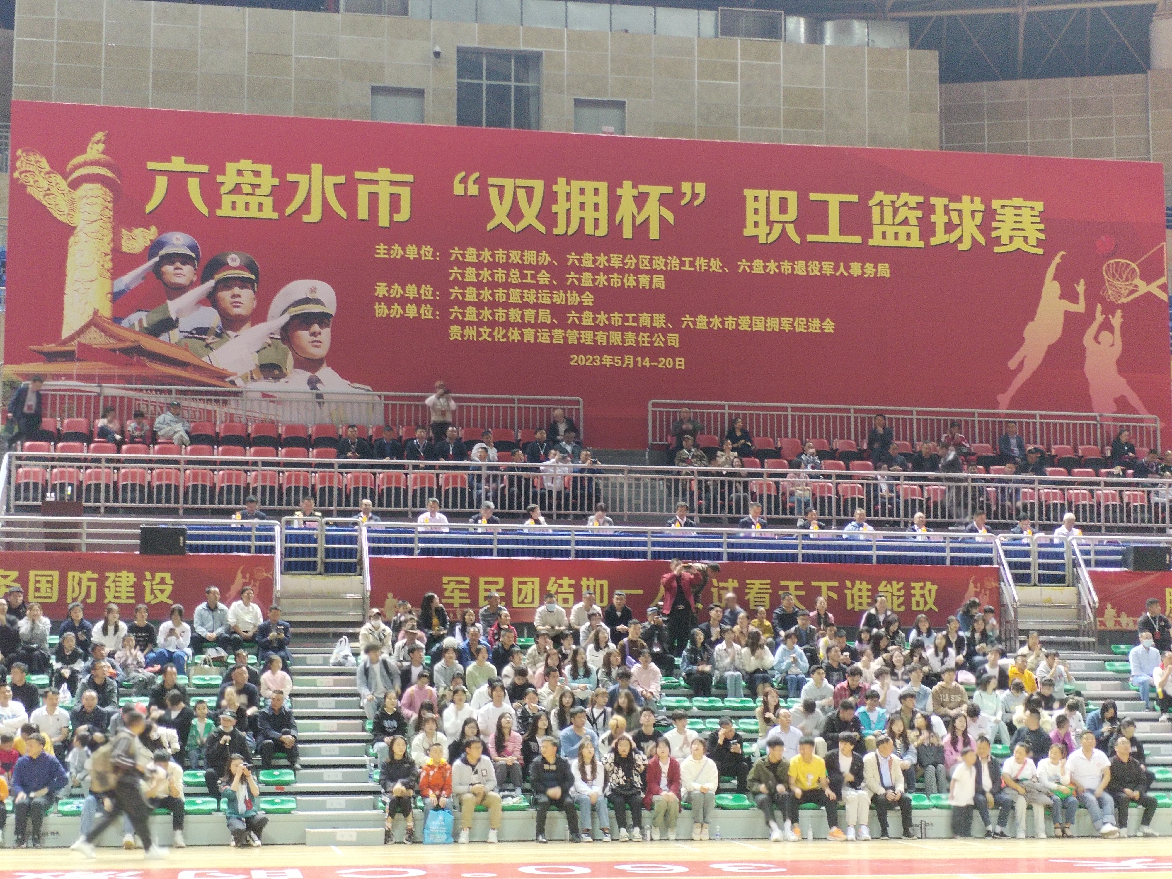 5月14日下午,由市双拥办、市总工会、市体育局、市退役军人局、六盘水军分区政治工作处主办,市篮协承办,市教育局、市工商联、市爱国拥军促进会、贵州文化体育运营管理有限责任公司协办的六盘水市“双拥杯”职工篮球赛在凉都体育中心体育馆举行。我校教职工代表队、40余名志愿者、200余名师生参加开幕式。
