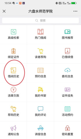 ②如果想要查询“借阅历史”,可进入“六盘水师范学院图书馆服务号”,点击“服务门户”里面的“借阅历史”即可看到借过的所有图书信息。