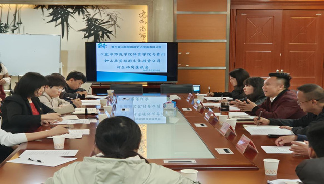 贵州钟山扶贫旅游文化投资公司总经理王文胜介绍了公司基本情况,对公司就业窗口展开了详细的说明,他希望学院能推荐熟知赛事编排、组织、策划宣传的毕业生前往公司就业,为钟山区“体育+旅游”产业注入新鲜血液;院长莫琰对学院的办学历史、现目前毕业生情况、师资情况等方面进行了介绍,并希望能与贵州钟山扶贫旅游文化投资公司在毕业生就业、产业发展、院企合作等方面寻求合作,为六盘水市体育+旅游产业发展添砖加瓦。