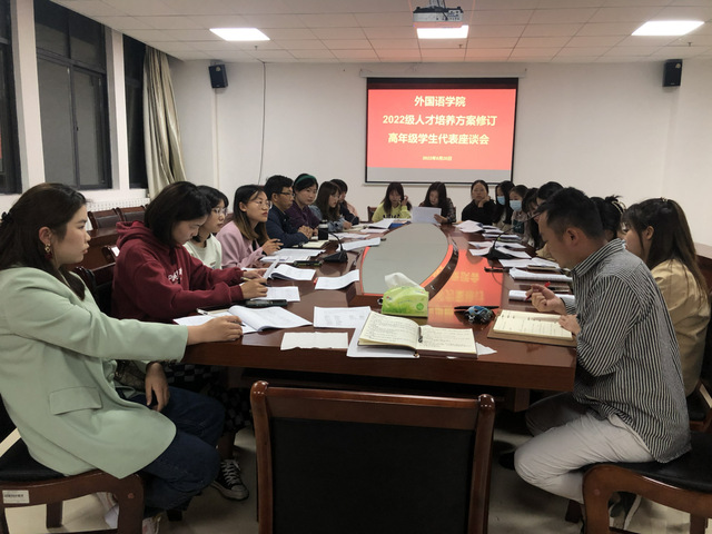 为制订2022级英语专业人才培养方案,进一步优化专业课程体系,5月20日,外国语学院在奥学楼710室召开人才培养方案论证高年级(英语专业2018级)学生代表意见征询座谈会。会议由外国语学院副院长吴得禄主持,英语系副主任汪阳、学校督导组成员蔡晓颖等出席会议。